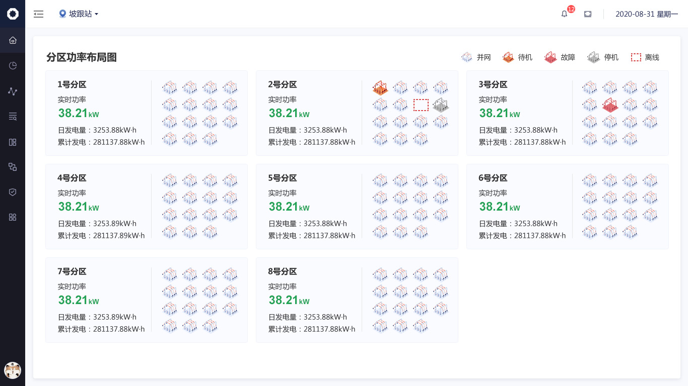 針對數(shù)據(jù)信息發(fā)生的變化,我們使用“場景化設(shè)計原則“,用立體圖標方式繪制出從”光伏板-逆變器-交流匯流箱“發(fā)電原理圖,把數(shù)據(jù)展示在對應(yīng)的環(huán)節(jié)中,形成可視化的實時監(jiān)控圖譜。;其余與發(fā)電流程無關(guān)的數(shù)據(jù)也均以圖標+文字的形式展示頁頁面右側(cè)。