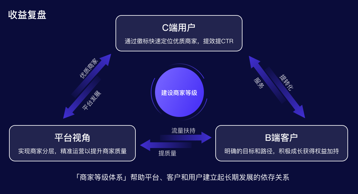 通過(guò)以上實(shí)施方案,設(shè)計(jì)師從不同視角切入,通過(guò)權(quán)益激勵(lì)吸引商家參與,通過(guò)明確用戶(hù)成長(zhǎng)路徑促進(jìn)等級(jí)提升和商家質(zhì)量的提升,為用戶(hù)提供更好的服務(wù),實(shí)現(xiàn)平臺(tái)生態(tài)的正向發(fā)展。