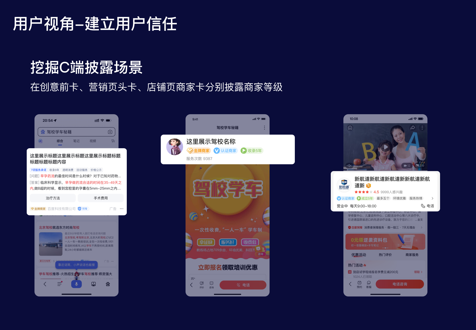 從用戶(hù)視角出發(fā),商家等級(jí)項(xiàng)目的主要目標(biāo)是建立用戶(hù)信任,所以設(shè)計(jì)師在強(qiáng)化徽標(biāo)設(shè)計(jì)的同時(shí),更需要挖掘用戶(hù)視角的披露場(chǎng)景,通過(guò)增加C端披露,幫助用戶(hù)了解該商家在百度生態(tài)內(nèi)的等級(jí)情況,以輔助用戶(hù)決策。本項(xiàng)目中在C端共新增3個(gè)場(chǎng)景進(jìn)行商家等級(jí)的披露,①搜索前卡;②營(yíng)銷(xiāo)頁(yè)頭卡;③店鋪?lái)?yè)首卡。在3個(gè)重點(diǎn)場(chǎng)景披露商家的等級(jí)徽標(biāo),用戶(hù)在選擇商家時(shí)可以參考商家的等級(jí),增強(qiáng)對(duì)商家的信任和認(rèn)知。