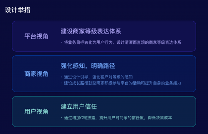 設(shè)計(jì)的基本出發(fā)點(diǎn)是幫助業(yè)務(wù)建設(shè)平臺(tái)等級(jí)模型的表達(dá)體系,將業(yè)務(wù)目標(biāo)轉(zhuǎn)化為用戶(hù)行為,設(shè)計(jì)清晰而直觀(guān)的商家分層表達(dá)體系,將不同商家等級(jí)與其對(duì)應(yīng)的特權(quán)、服務(wù)等信息進(jìn)行明確的關(guān)聯(lián)和傳達(dá),以便商家能夠快速理解和辨識(shí)商家等級(jí)的差異和優(yōu)勢(shì)。