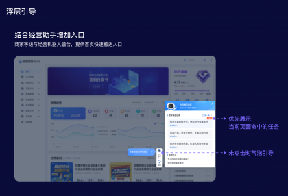 浮層:將操作入口前置披露,提升商家感知同時(shí)還可以縮短操作步長(zhǎng)。在商家等級(jí)項(xiàng)目里,衡量商家主動(dòng)經(jīng)營(yíng)的標(biāo)準(zhǔn)是做任務(wù),所以任務(wù)入口的前置披露是提升主動(dòng)經(jīng)營(yíng)的關(guān)鍵舉措。于是,圍繞商家等級(jí)包裝了“經(jīng)營(yíng)助手”的概念,幫助平臺(tái)給商家推薦一些成長(zhǎng)任務(wù)和優(yōu)化建議,并在平臺(tái)首頁(yè)主動(dòng)彈出,以此提高任務(wù)觸達(dá)率。但使用這種主動(dòng)觸達(dá)手段時(shí),需要考慮對(duì)商家的打擾和阻斷情況,所以需要對(duì)主動(dòng)彈出的頻率作限制,然后配合氣泡和標(biāo)簽等視效元素吸引商家視線(xiàn)。這樣可以引導(dǎo)商家參與商家等級(jí)完成任務(wù),促進(jìn)其成長(zhǎng)和等級(jí)提升。