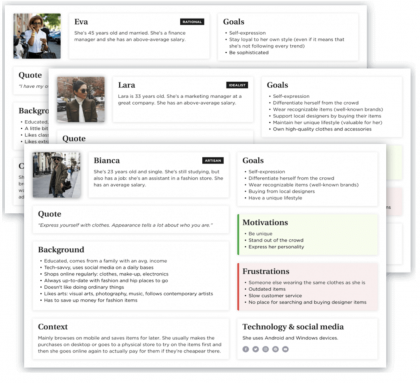 按照我們的邏輯順序,首先是創(chuàng)建角色。我們幾乎在所有項(xiàng)目中都會(huì)使用。基于我們的產(chǎn)品或服務(wù)的目標(biāo)群體,即不同的潛在客戶(hù),構(gòu)建虛構(gòu)人物個(gè)性。這個(gè)工具可以讓我們更多地了解客戶(hù)的需求、問(wèn)題、動(dòng)機(jī)和行為。我們通過(guò)研討會(huì)、頭腦風(fēng)暴或通過(guò)定性和定量研究“簡(jiǎn)單地”收集盡可能多的數(shù)據(jù)來(lái)實(shí)現(xiàn)這一目標(biāo)。