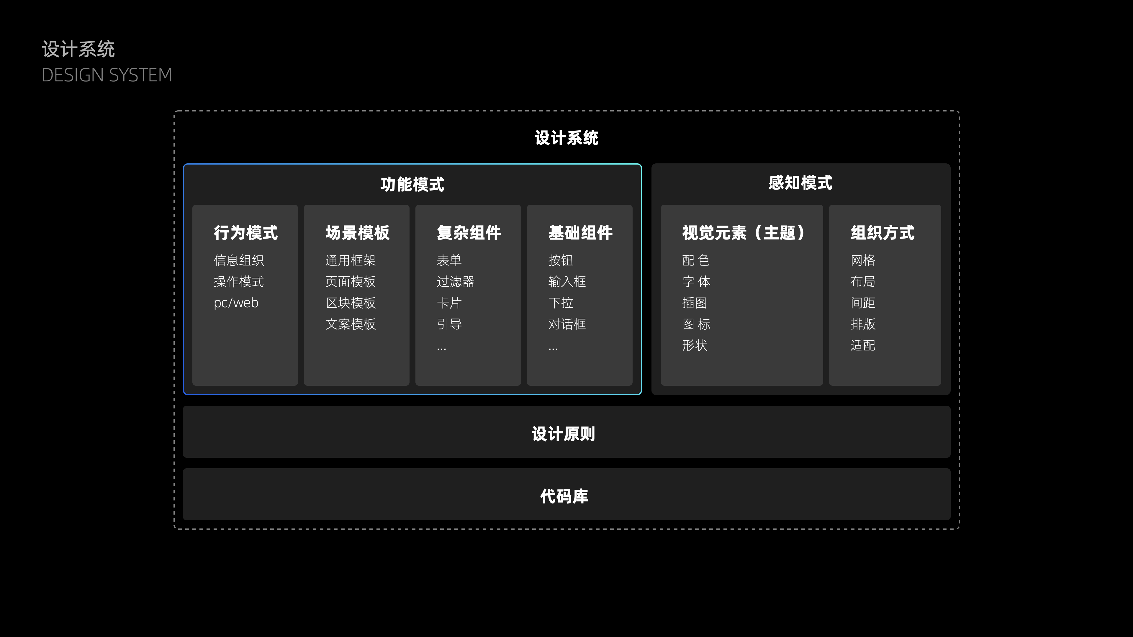 大多數(shù)日常需求大多是從單點出發(fā),當點變多變復雜了,就容易出現(xiàn)上述說到的現(xiàn)狀問題。所以解決方案需要基于業(yè)務全盤進行設計抽象:從元素——組件——區(qū)塊——頁面——功能流程沉淀設計規(guī)則并代碼化,來靈活提供拼裝N個不同頁面的機制,幫助團隊更系統(tǒng)化的進行產(chǎn)品設計。從組成內(nèi)容不難看出,解決方案是需要建立在基礎組件基礎上,與基礎組件、復雜組件、行為模式共同組成設計系統(tǒng)的【功能模式】部分。