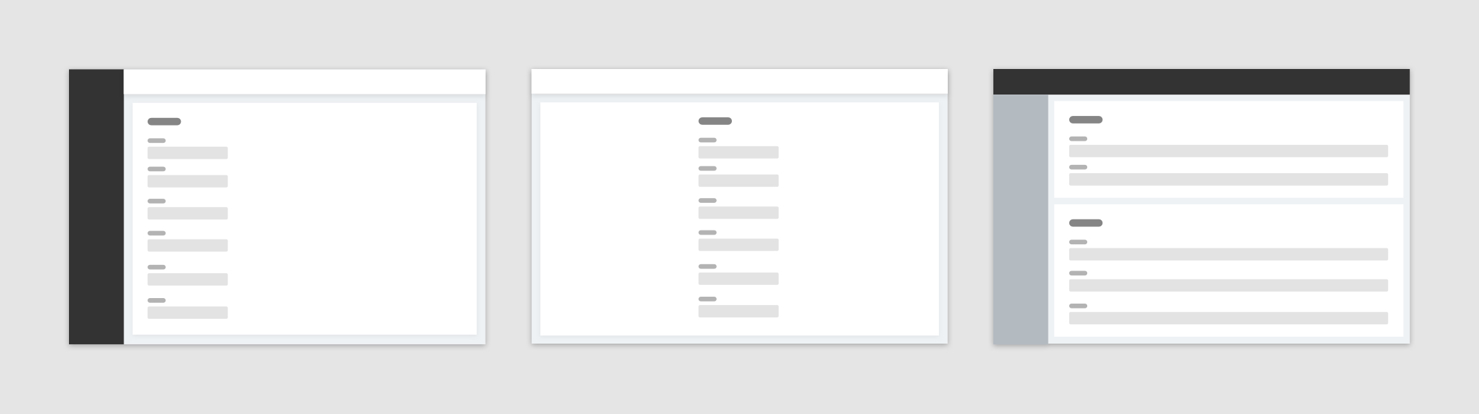 卡片分組布局一般用來處理高復(fù)雜類型表單。當(dāng)業(yè)務(wù)中希望頁(yè)面承載眾多表單字段時(shí),可將信息相關(guān)性弱的字段拆分為多個(gè)部分,并通過多個(gè)卡片分組承載不同類型字段,每個(gè)卡片都需有個(gè)卡片類別標(biāo)題。