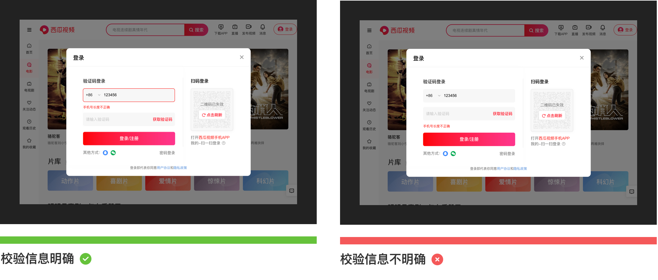 錯(cuò)誤校驗(yàn)提示一般存在于錯(cuò)誤率較高情況下出現(xiàn),如:在登錄注冊(cè)時(shí),要求用戶填寫手機(jī)號(hào),如果用戶輸入的手機(jī)號(hào)碼不符合特定的輸入格式,那么這時(shí)候需要明確標(biāo)記錯(cuò)誤原因,準(zhǔn)確的幫助用戶找到問題并解決,避免錯(cuò)誤提示描述模糊不清誤導(dǎo)用戶。錯(cuò)誤提示一般會(huì)采用“雙重視覺強(qiáng)調(diào)”來顯示錯(cuò)誤,除了輸入框突出顯示外,同時(shí)需要在輸入框下方加入紅色指導(dǎo)文字。如下圖所示為西瓜視頻登錄注冊(cè)場(chǎng)景下的截圖:
