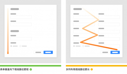 如果表單使用單列,則完成的路徑是頁(yè)面垂直向下的一條直線,單列布局能夠給用戶呈現(xiàn)一條清晰的視覺路。因此,表單較為簡(jiǎn)單時(shí)盡量避免將表單分成多列,在業(yè)務(wù)場(chǎng)景允許的情況盡量使用單列(部分業(yè)務(wù)訴求和一些特定場(chǎng)景要求,多列布局會(huì)更節(jié)省垂直空間,但是多列布局需要考慮字段之間的關(guān)聯(lián)性,這里不強(qiáng)求一定只能使用單列布局)。