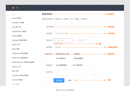 表單組件:包含了輸入框、下拉框、日期選擇器、時(shí)間選擇器、開關(guān)、上傳等十幾種類型,是形成表單的核心內(nèi)容;