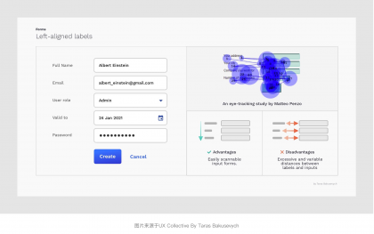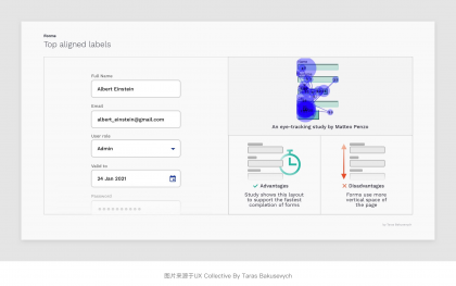 將表單標(biāo)簽放置在其對(duì)應(yīng)輸入字段的正上方,并垂直左對(duì)齊排列,用戶只需依次向下瀏覽即可看到標(biāo)簽與輸入字段兩個(gè)元素。其優(yōu)勢(shì)是橫向屏幕空間足夠,能夠比較友好的適配多語(yǔ)言適合非中國(guó)區(qū)業(yè)務(wù)表單使用。并且根據(jù)上面Matteo Penzo的時(shí)間表上看,頂部對(duì)齊的瀏覽和填寫的效率也是3種常規(guī)的對(duì)齊方式中較高的一種。不足點(diǎn)是會(huì)占用較多的縱向垂直屏幕空間,此外應(yīng)當(dāng)注意每組表單標(biāo)簽和輸入字段與其他字段組的間距,以免層級(jí)區(qū)分度不夠的問題。