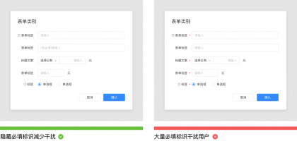 當(dāng)表單中的必填信息多于非必填信息時(shí),如果使用紅色星號(hào)表示必填項(xiàng),那么大量紅色星號(hào)導(dǎo)致增加用戶的認(rèn)知負(fù)擔(dān),使得用戶無(wú)法快速識(shí)別哪些是必須填寫的,哪些是不必須填寫。并且使用紅色星號(hào)會(huì)帶給用戶一些恐懼感,它增加了出錯(cuò)的風(fēng)險(xiǎn)并降低了表單填寫率。因此在表單設(shè)計(jì)中,當(dāng)必填項(xiàng)多于非必填項(xiàng)時(shí),隱藏紅色星號(hào)標(biāo)記,通過暗提示標(biāo)記可選項(xiàng)的形式來幫助用戶識(shí)別。