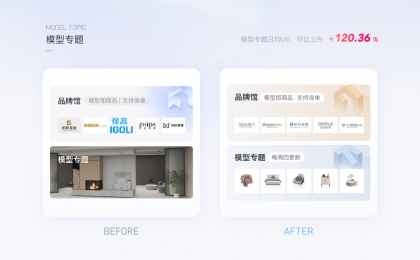 群核下的設(shè)計(jì)工具,以專(zhuān)題化的形式聚類(lèi)商家、平臺(tái)推薦的模型是基本的運(yùn)營(yíng)動(dòng)作,如下圖,原本以真實(shí)效果圖的方式展示模型專(zhuān)題,用戶難以感知是方案還是模型。通過(guò)封面圖形的優(yōu)化:將核心的模型類(lèi)型展示出來(lái),用戶能夠預(yù)見(jiàn)里面的內(nèi)容。