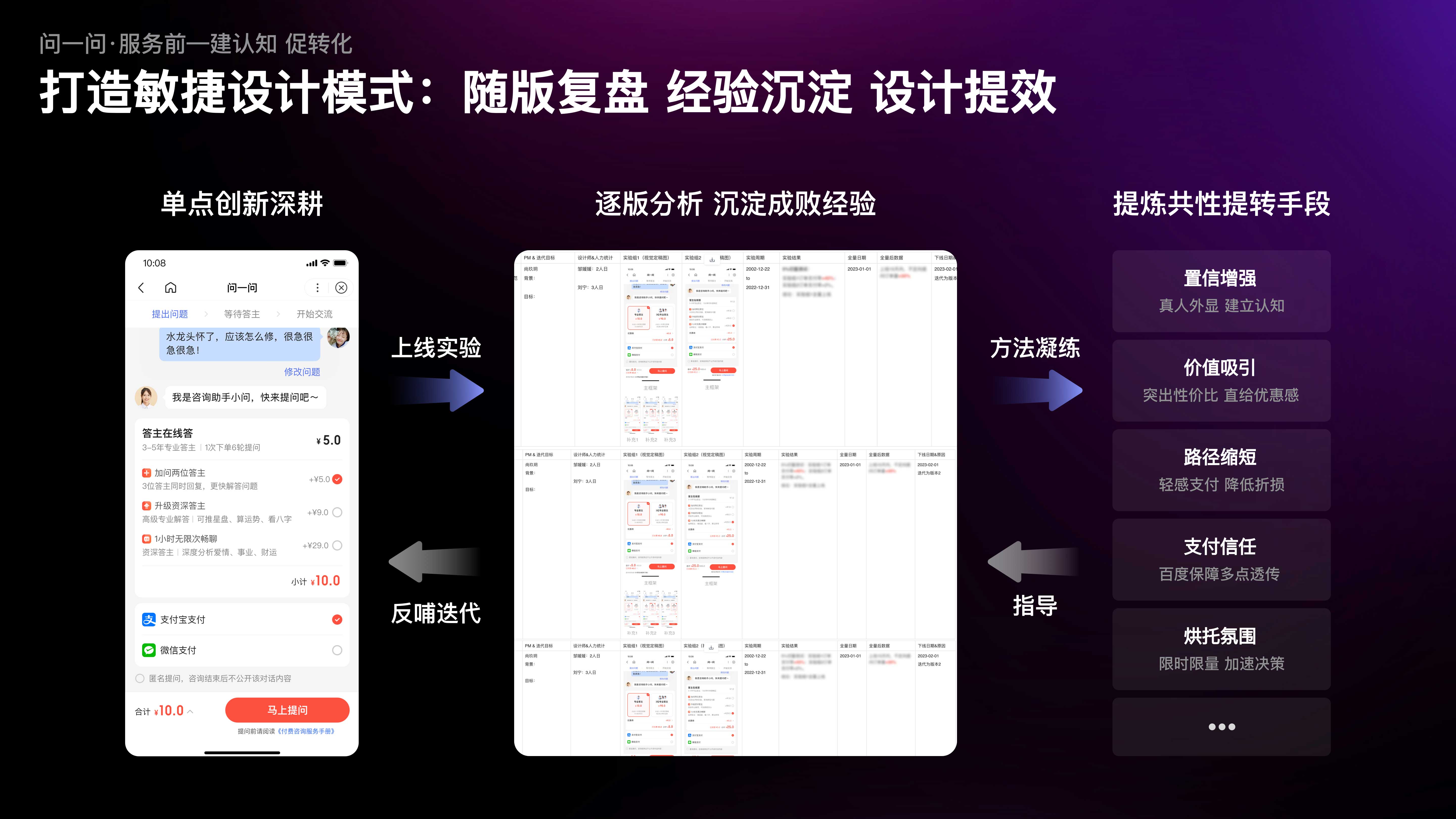 ?為了進(jìn)一步提升設(shè)計(jì)效率,我們將提問頁的迭代歷史進(jìn)行線上化記錄,并組織團(tuán)隊(duì)定期復(fù)盤總結(jié),提煉出「真人外顯-增強(qiáng)置信感」「優(yōu)惠直給-突出性價(jià)比」「路徑縮短-弱化支付感」等一系列通用的提轉(zhuǎn)手段;又將這些手段復(fù)用到服務(wù)上下游環(huán)節(jié)的同類場(chǎng)景中,通過系統(tǒng)化提轉(zhuǎn),有效幫助業(yè)務(wù)訂單量、GMV大幅提升。