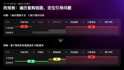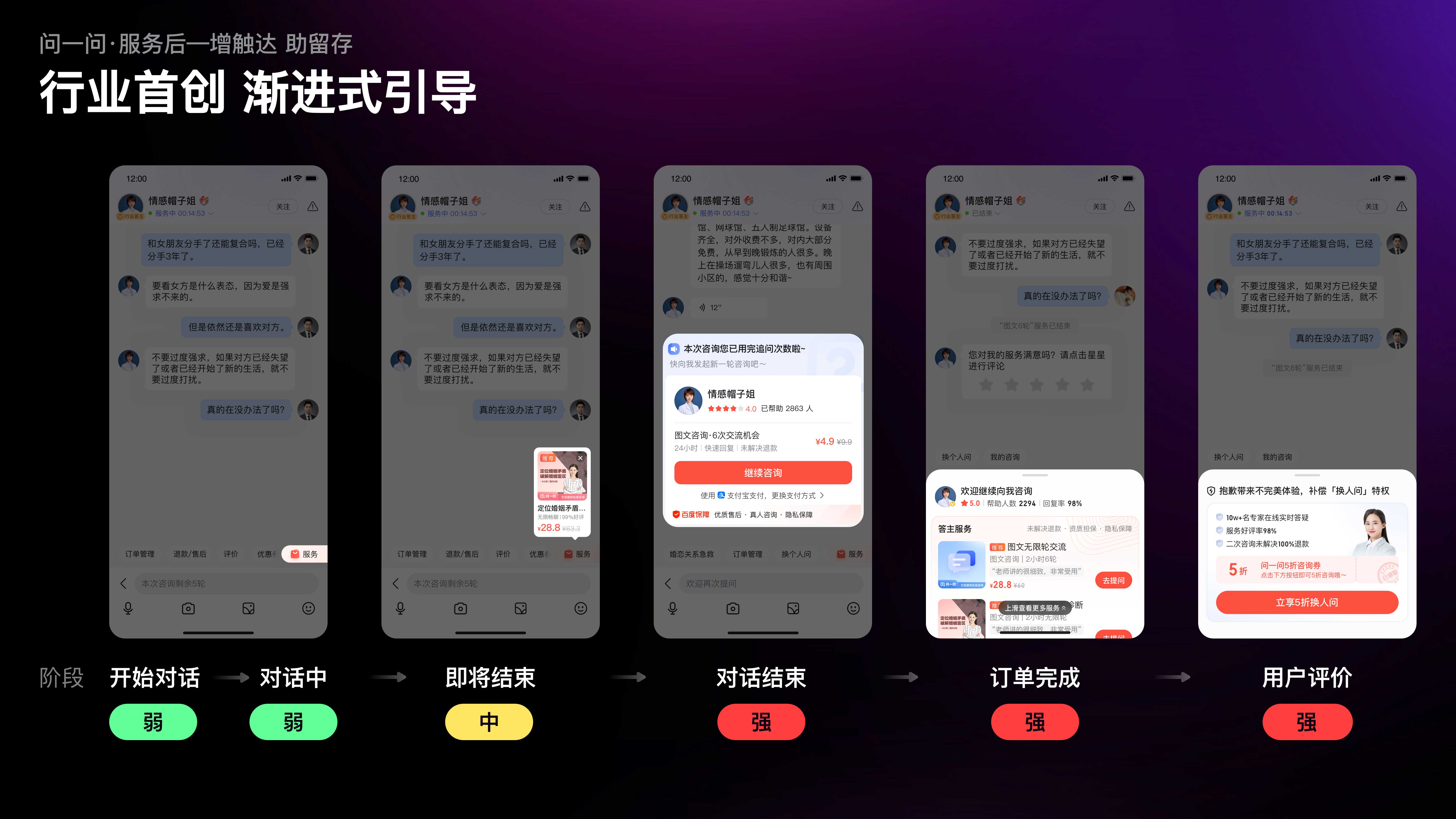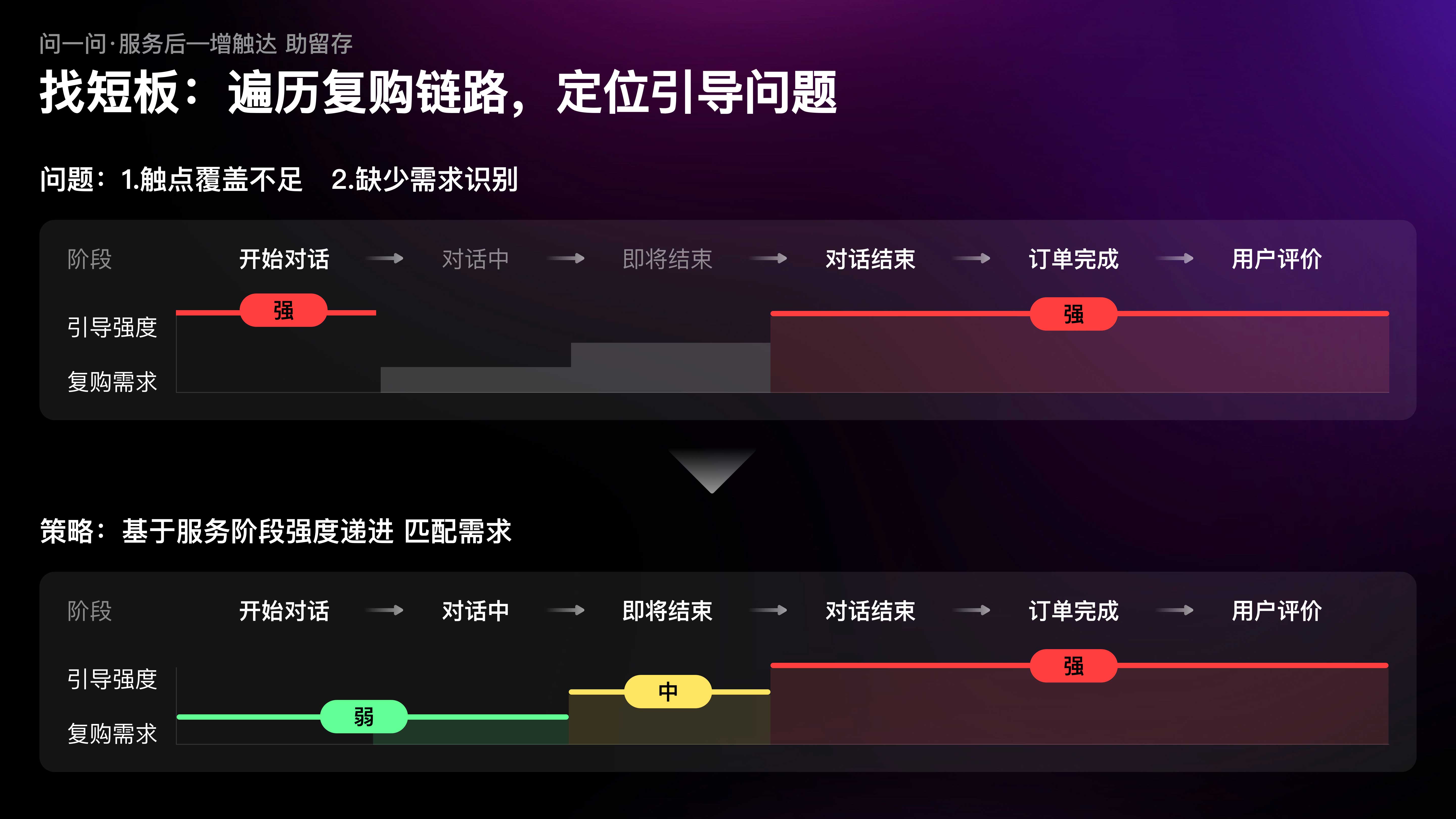 當(dāng)我們以用戶視角,遍歷咨詢鏈路中的復(fù)購引導(dǎo)時(shí),發(fā)現(xiàn)復(fù)購引導(dǎo)的觸點(diǎn)覆蓋不足,且缺少對(duì)特定場(chǎng)景下需求的識(shí)別,例如在咨詢開始時(shí)復(fù)購需求極弱,但設(shè)計(jì)引導(dǎo)極強(qiáng);而在隨后的對(duì)話過程中需求漸增,但引導(dǎo)缺失。因此,我們制定了行業(yè)首創(chuàng)的漸進(jìn)式引導(dǎo)策略;隨著服務(wù)推進(jìn),復(fù)購需求漸增,觸達(dá)強(qiáng)度也逐級(jí)遞進(jìn)。