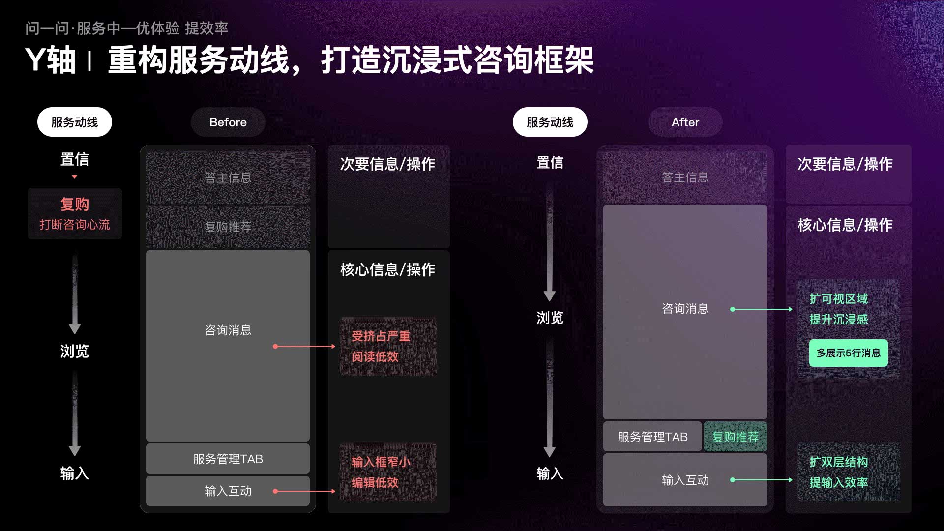?到了新的發(fā)展階段,我們的設(shè)計(jì)愿景該如何實(shí)現(xiàn)?問一問設(shè)計(jì)團(tuán)隊(duì)以“服務(wù)體驗(yàn)”為原點(diǎn),發(fā)起了C端核心服務(wù)體驗(yàn)的升級(jí)專項(xiàng)。借助用戶觀察、體驗(yàn)遍歷等方法,沿用戶真實(shí)體驗(yàn)路徑梳理服務(wù)“前-中-后”各階段的關(guān)鍵問題、挖掘優(yōu)化機(jī)會(huì)。再結(jié)合設(shè)計(jì)、體驗(yàn)雙視角,建立以服務(wù)前“建認(rèn)知、促轉(zhuǎn)化”、服務(wù)中“優(yōu)體驗(yàn)、提效率”、服務(wù)后“增觸達(dá)、助留存”為核心指導(dǎo)原則的設(shè)計(jì)打法。通過切實(shí)滿足用戶在服務(wù)各階段需求來激發(fā)持續(xù)消費(fèi)、讓服務(wù)閉環(huán)順暢運(yùn)轉(zhuǎn),從而有效地賦能業(yè)務(wù)增長,達(dá)到體驗(yàn)和收入的雙豐收。