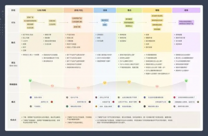 用戶旅程圖是一種圖形化工具,用于詳細(xì)描述用戶在使用產(chǎn)品或服務(wù)時(shí)所經(jīng)歷的各個(gè)階段和步驟。它能夠展示用戶的整個(gè)使用過程,包括用戶的需求、痛點(diǎn)、態(tài)度和行為,以及產(chǎn)品或服務(wù)如何與用戶進(jìn)行互動(dòng)。作為產(chǎn)品設(shè)計(jì)者,我們可以通過用戶旅程圖更好地理解用戶需求,提前發(fā)現(xiàn)后續(xù)的用戶體驗(yàn)問題,并思考如何提升產(chǎn)品或服務(wù)的用戶體驗(yàn)。