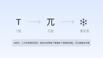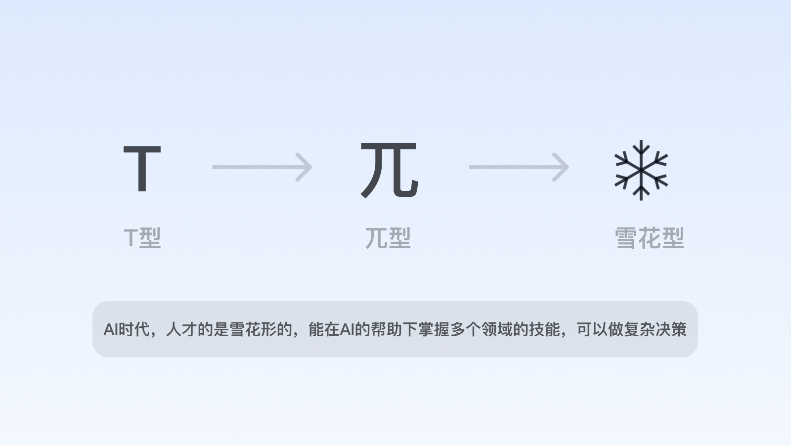 在人工智能時(shí)代,部分重復(fù)性、初級(jí)的設(shè)計(jì)需求將被替代,設(shè)計(jì)師乃至互聯(lián)網(wǎng)職場人的能力維度將隨之會(huì)有所改變,善用AI的綜合能力素養(yǎng)變?yōu)閯傂?,在能力維度上接近于“雪花型”。