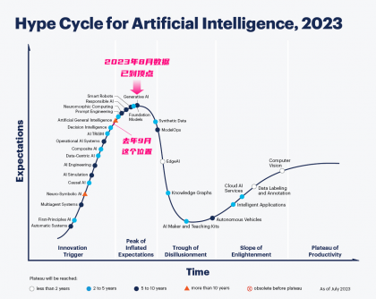去年9月份,「Gartner」就預(yù)測生成式AI已經(jīng)進(jìn)入期望膨脹高位,到2023年8月「Gartner」剛發(fā)布人工智能技術(shù)成熟度曲線,生成式AI從技術(shù)萌芽期到技術(shù)膨脹期的頂峰,跟過去一段時(shí)間AI在學(xué)術(shù)、產(chǎn)業(yè)、資本領(lǐng)域的爆火完全呼應(yīng)。