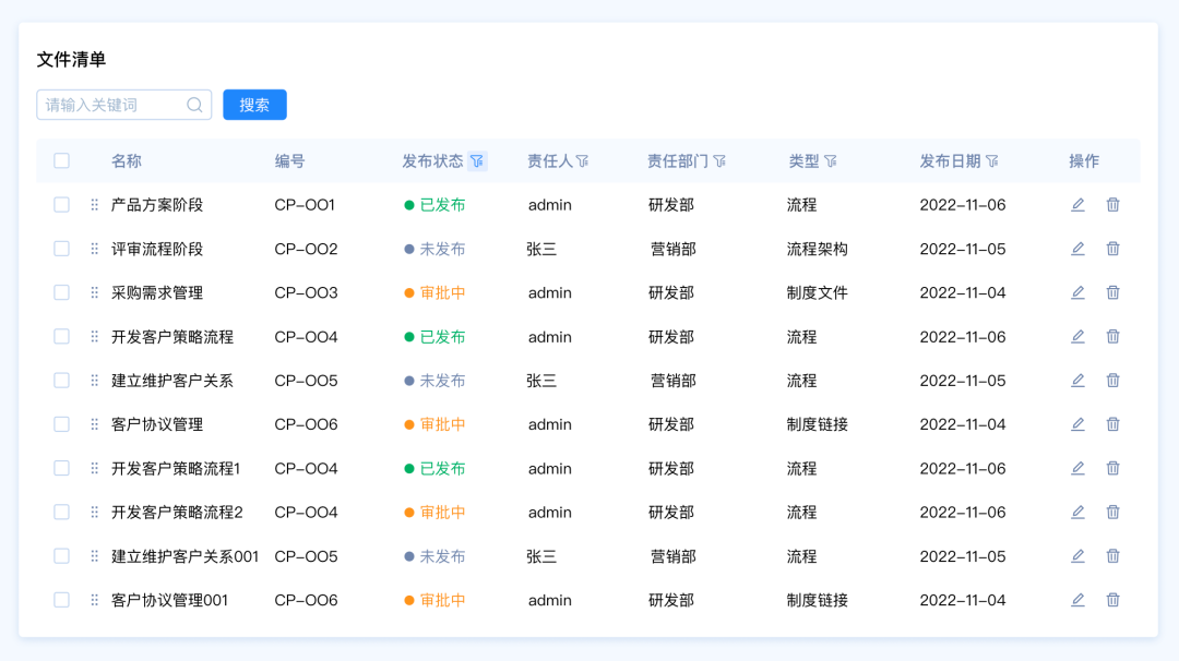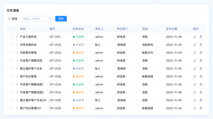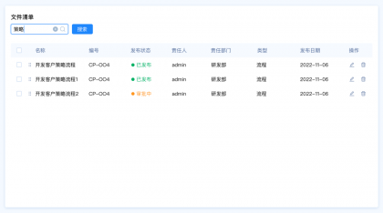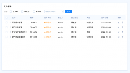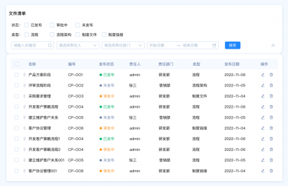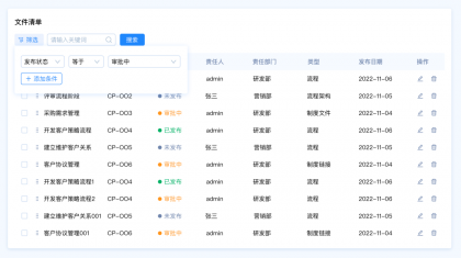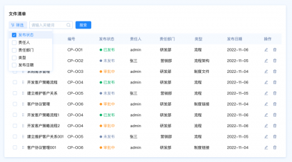 設(shè)計要點:由于這里包含多種篩選類型,名稱和編號是關(guān)鍵詞篩選,發(fā)布狀態(tài)和、責(zé)任人、責(zé)任部門、類型是選項篩選,發(fā)布日期是時間區(qū)間篩選。所以我們需要采用組合篩選的模式。