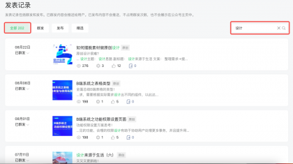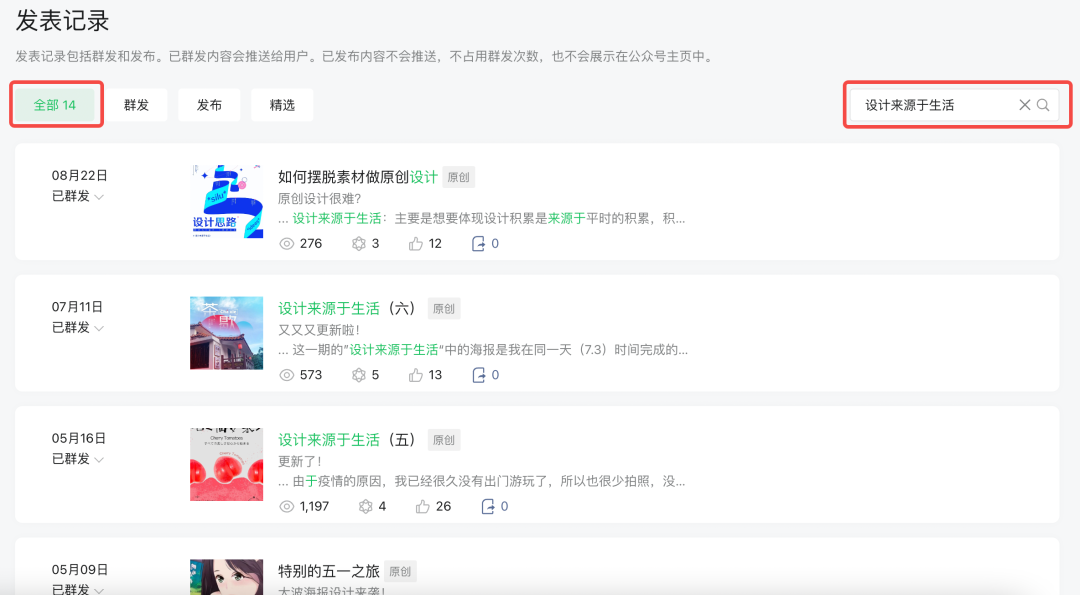 例如在微信公眾號發(fā)表記錄中的搜索,當(dāng)只輸入“設(shè)計”關(guān)鍵詞時,搜索結(jié)果一共有202條,需要在這202條數(shù)據(jù)中找到自己的目標值是比較難的。