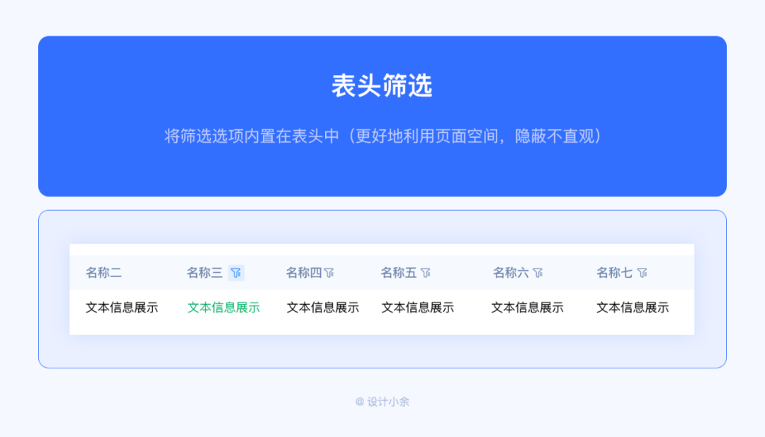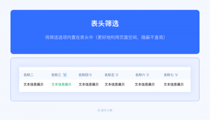 將篩選選項內(nèi)置在表頭中(更好地利用頁面空間,隱蔽不直觀)。當(dāng)頁面空間有限時,可以考慮此方案。另外當(dāng)表格表頭字段數(shù)據(jù)較多時,需要橫向滑動查看數(shù)據(jù)時,建議還是直接將篩選條件單獨放在外面?;蛘弋?dāng)需要篩選的選項太多時,表頭字段都能篩選時,也可以考慮放在表頭中。