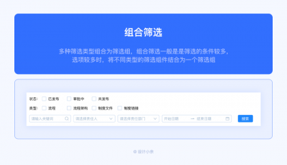 多種篩選類型組合為篩選組,組合篩選一般是是篩選的條件較多,選項較多時,將不同類型的篩選組件結(jié)合為一個篩選組。用戶在使用時,只需要將所有的條件輸入/選擇后,點擊搜索即可完成篩選,得到的結(jié)果將是多個條件組合后的并集/合集的值。