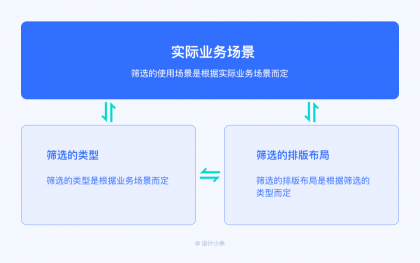 篩選的類型是根據(jù)業(yè)務(wù)場景而定,篩選的排版布局是根據(jù)篩選的類型而定,篩選的使用場景是根據(jù)實際業(yè)務(wù)場景而定,所以首先我們需要理解清楚真實的業(yè)務(wù)場景,再通過分析選擇適合的篩選類型,當(dāng)已經(jīng)知道了篩選類型,我們只需要根據(jù)篩選的條件和頁面的交互及空間利用情況選擇合適的布局方式即可。