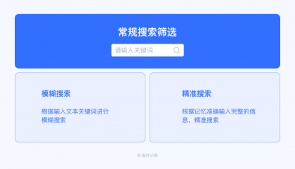 常規(guī)的搜索篩選不難理解,即常見的搜索框,根據(jù)輸入文本關(guān)鍵詞進行模糊搜索或者根據(jù)記憶準確輸入完整的信息,精準搜索。文本關(guān)鍵詞搜索需要通過用戶的記憶來完成,只有當(dāng)用戶對需要搜索的內(nèi)容(關(guān)鍵詞)有記憶才能完成搜索篩選,搜索的結(jié)果范圍根據(jù)關(guān)鍵詞的精準度而定。