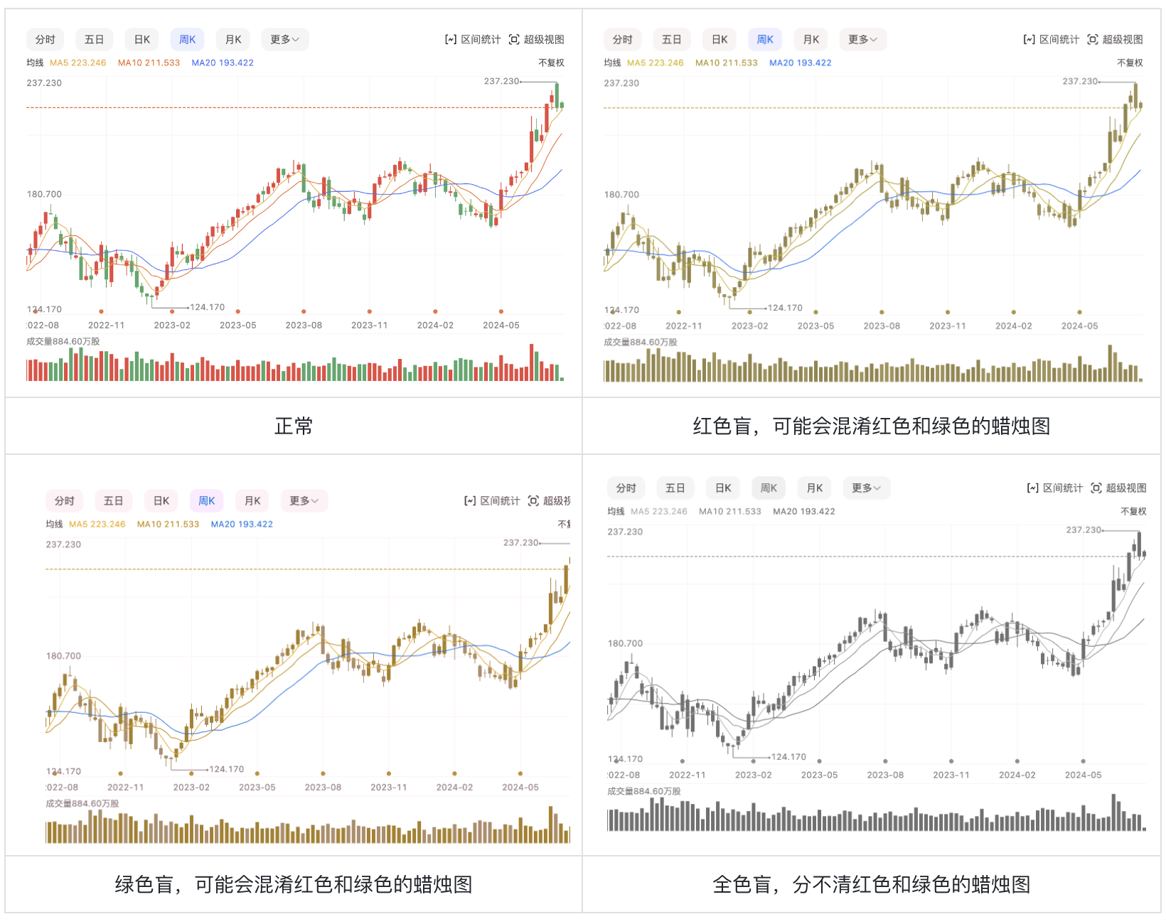 在股票市場中,顏色編碼是信息傳達的重要手段。許多分析工具使用紅色和綠色來表示虧損和盈利,這種直觀的視覺信號對大多數(shù)投資者十分有效。然而,色盲投資者在分析市場動態(tài)時,往往因無法準確分辨這些顏色而產(chǎn)生誤解,影響他們的決策能力。例如,紅綠色盲的投資者在分析股票個股時,可能會混淆紅色和綠色的蠟燭圖,導致錯誤的投資判斷。