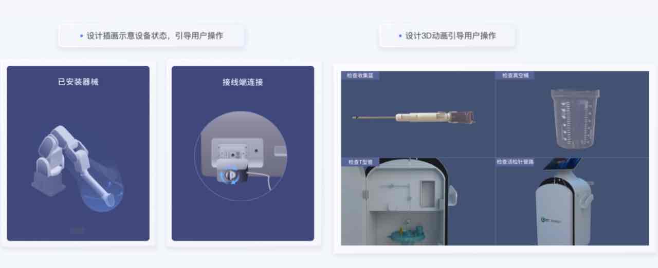 隨著科技的飛速發(fā)展,人工智能(AI)正悄悄改變醫(yī)療健康行業(yè),為其帶來前所未有的數(shù)字化轉(zhuǎn)型。未來,醫(yī)療健康行業(yè)將迎來個性化、精準(zhǔn)化、智能化的新時代。設(shè)備操作界面是醫(yī)師操控機器人的窗口,操作界面設(shè)計易用、直觀、美觀度直接影響到醫(yī)療機器人的使用效果和產(chǎn)品的品牌價值。人性化的操作界面可以提高操作者的工作效率和操作的舒適度,降低操作的學(xué)習(xí)成本和出錯率,提高手術(shù)精準(zhǔn)度和手術(shù)成功率。在UI設(shè)計中,我們結(jié)合真實的使用場景,加入插畫和建模動畫的設(shè)計,引導(dǎo)醫(yī)護(hù)人員進(jìn)行操作,從而使操作更加直觀易用,提高工作效率。