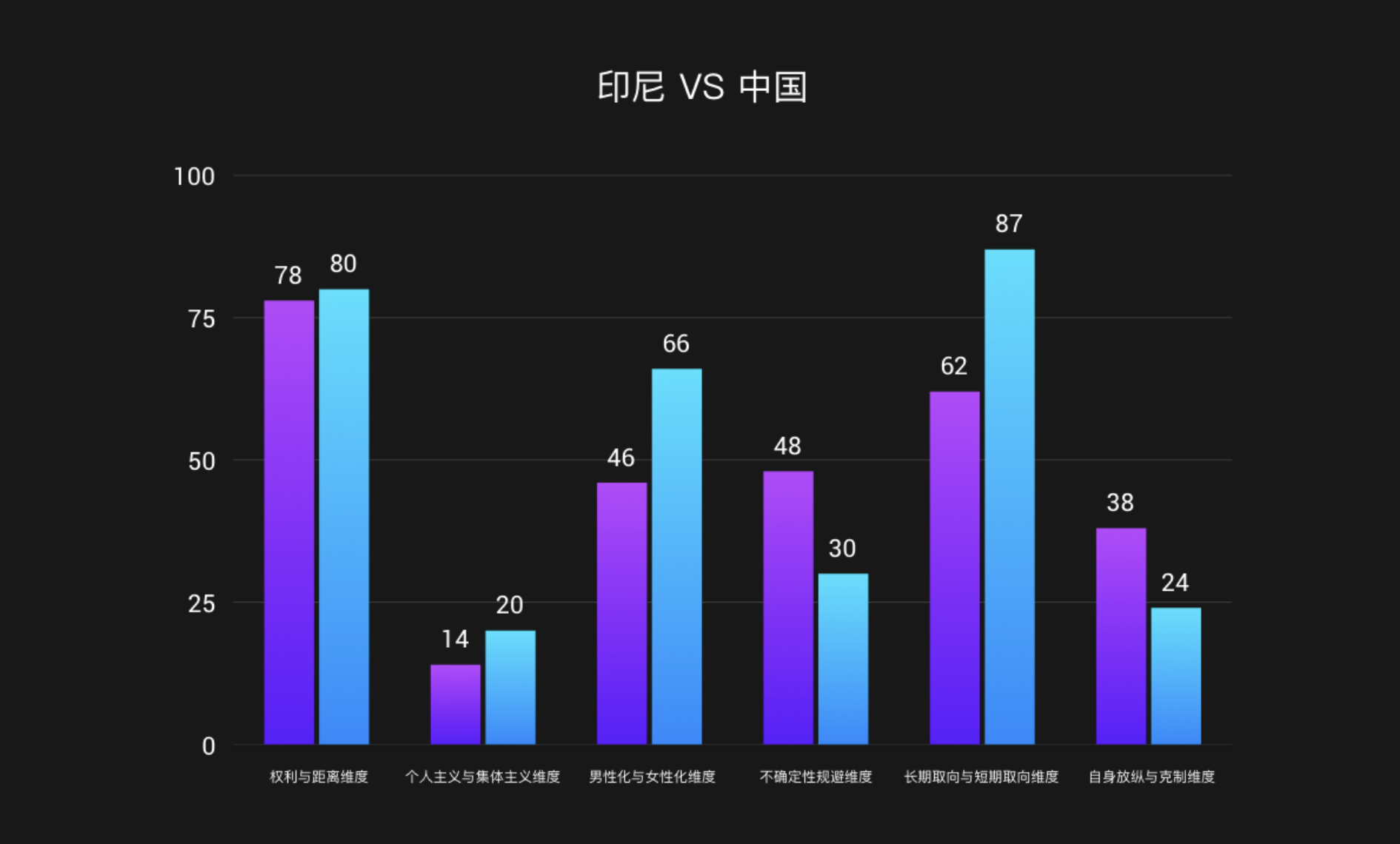 長期取向與短期取向維度是指“ 人們對時間的基本取向“,長期取向的國家更多會著眼于未來的長期目標,而短期取向國家的人們認為活在當下更實際。在這個維度中,印尼分數(shù)是 62 分,中國 87 分,屬于長期取向國家。