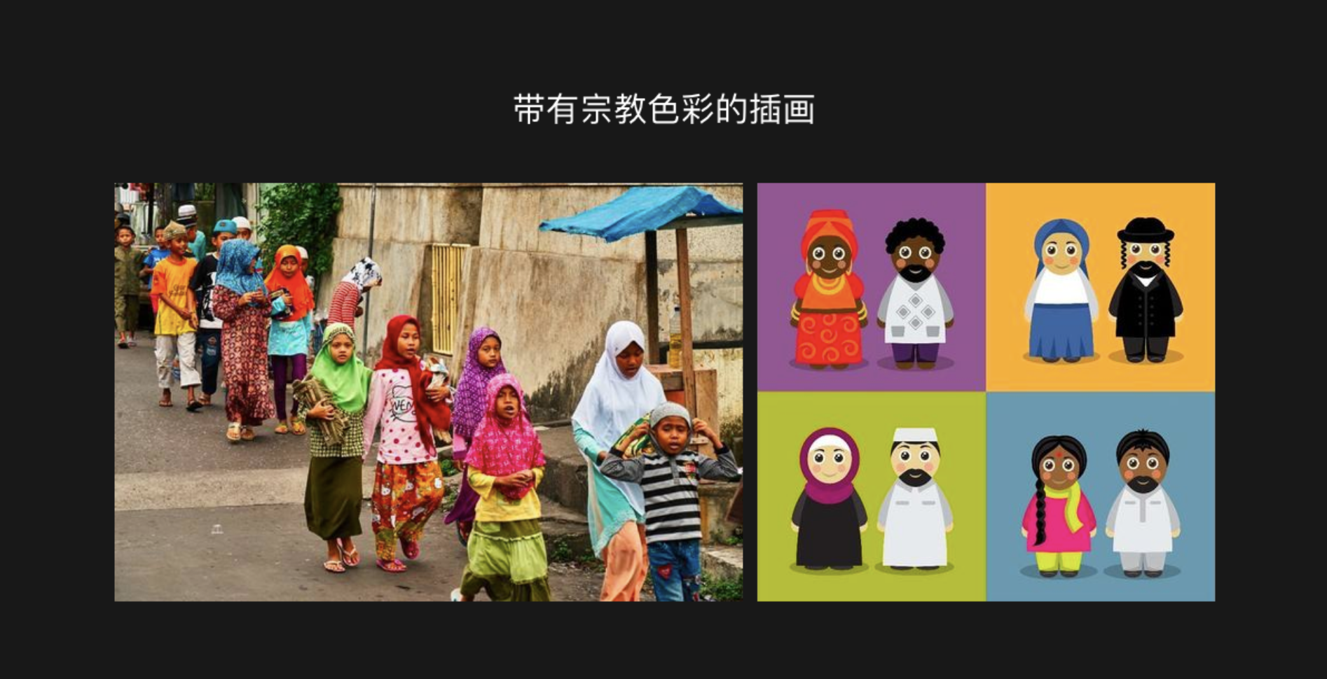 穆斯林在正式的場合,穿著要莊重得體。男性一般身穿白襯衫長褲,女性要戴頭巾,不能穿暴露的服裝。由于宗教的原因,有的女性在日常生活中也會有戴頭巾的習慣。如果在人物插畫設計中想要有比較強的宗教色彩,那么可以選擇融入這個元素。