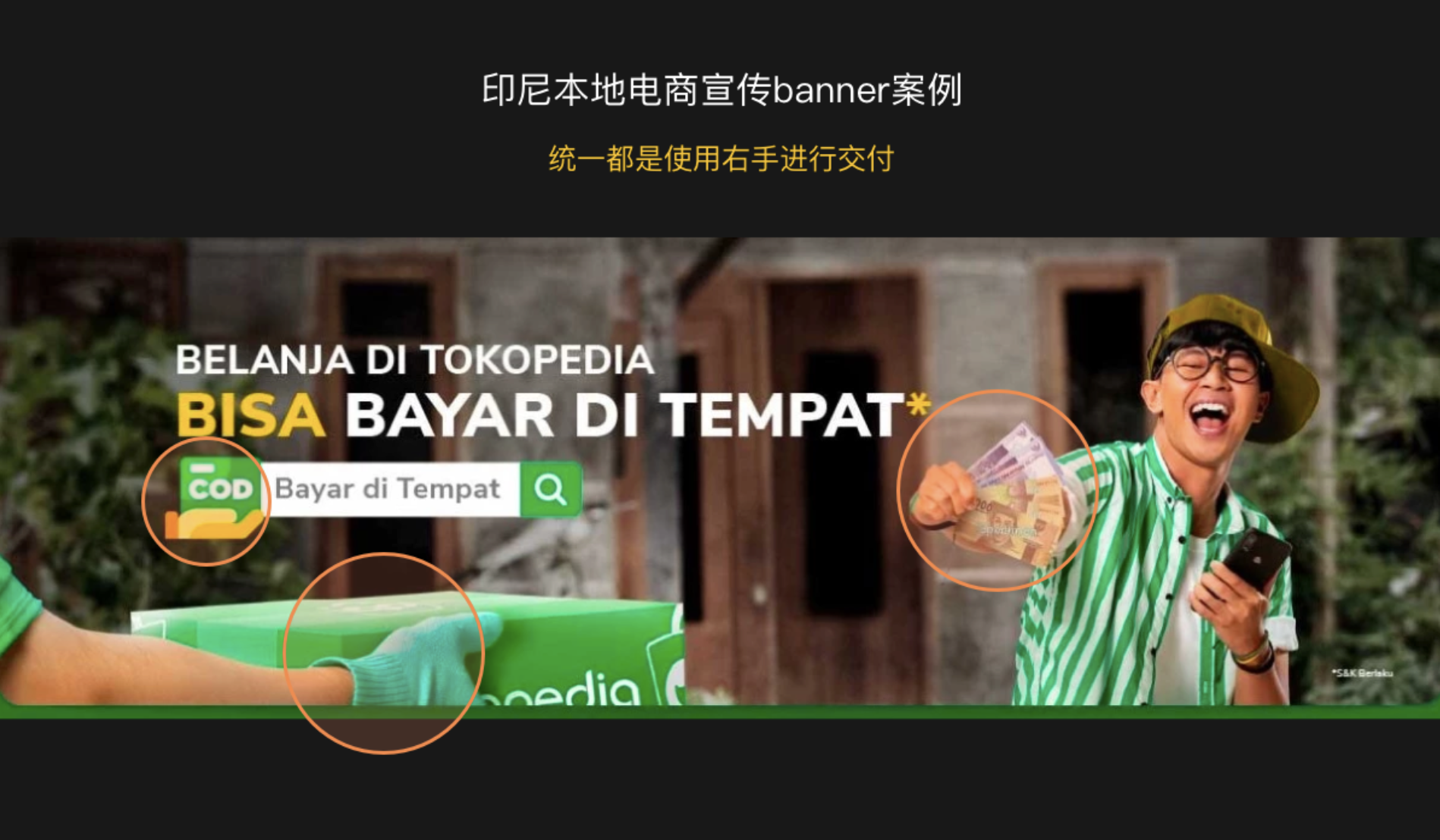 穆斯林有一個習俗,只有右手才能用來給予或者接受,左手是用來上廁所的。在印尼,用左手遞給別人東西,尤其是食物或者飲料,或者用左手握手,都是粗魯和無禮的行為。在設計中,我們要避免使用左手拿東西或者握手的圖畫,在模特圖中,也要避免使用左手
