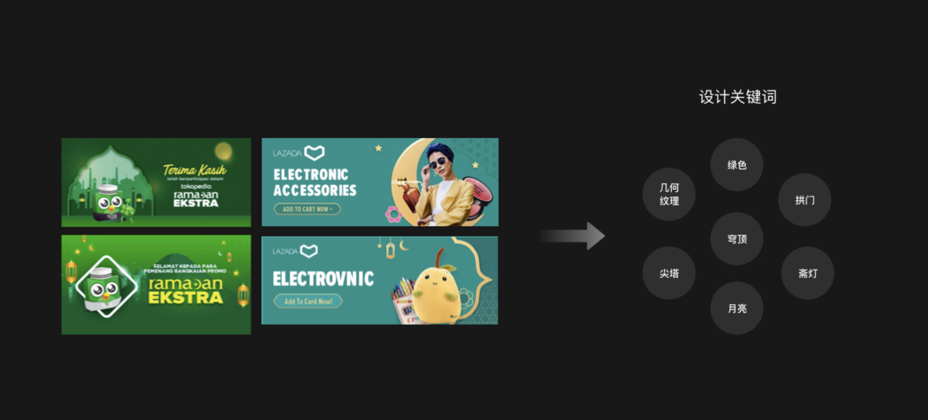 所以在這個期間做活動宣傳時,可以多運用伊斯蘭教的一些元素,例如:齋月的齋燈,月亮,以及伊斯蘭教寺廟的尖塔、穹頂和幾何紋理的裝飾等等,都可以融入到設計中,形成獨特的本土風格,更容易獲得當?shù)厝说南矏酆驼J可。
