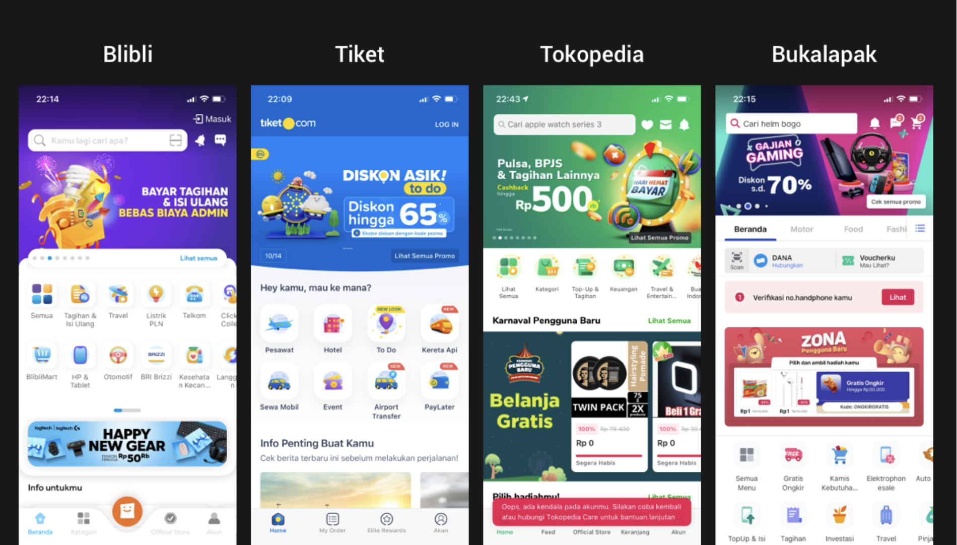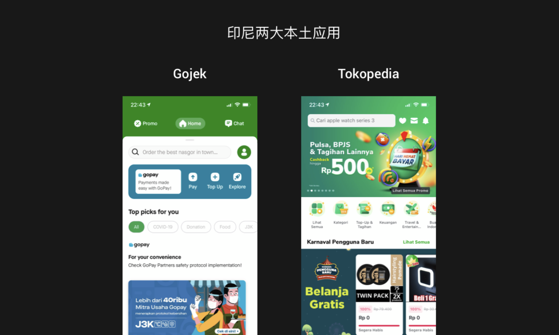 由于是穆斯林國家,綠色深受當?shù)厝讼矏?。在伊斯蘭教中,綠色象征著生命與自然。除了綠色,白色和藍色也是當?shù)厝嗣袼矏鄣念伾?。在選擇自己產(chǎn)品的主色調時,不妨參考這幾種顏色。下圖是印尼的兩大本土應用,Gojek 是當?shù)氐囊粋€超級 APP,提供出行、物流、食品、購物、支付等一站式服務,可以理解為是滴滴、美團、餓了么、支付寶、順豐等這些公司產(chǎn)品服務的集合,Tokopedia 是當?shù)氐碾娚唐脚_。兩家都選擇了綠色為主色調,這是因為創(chuàng)始人有虔誠的信仰,在伊斯蘭教中,綠色通常被認為是伊斯蘭教的象征。