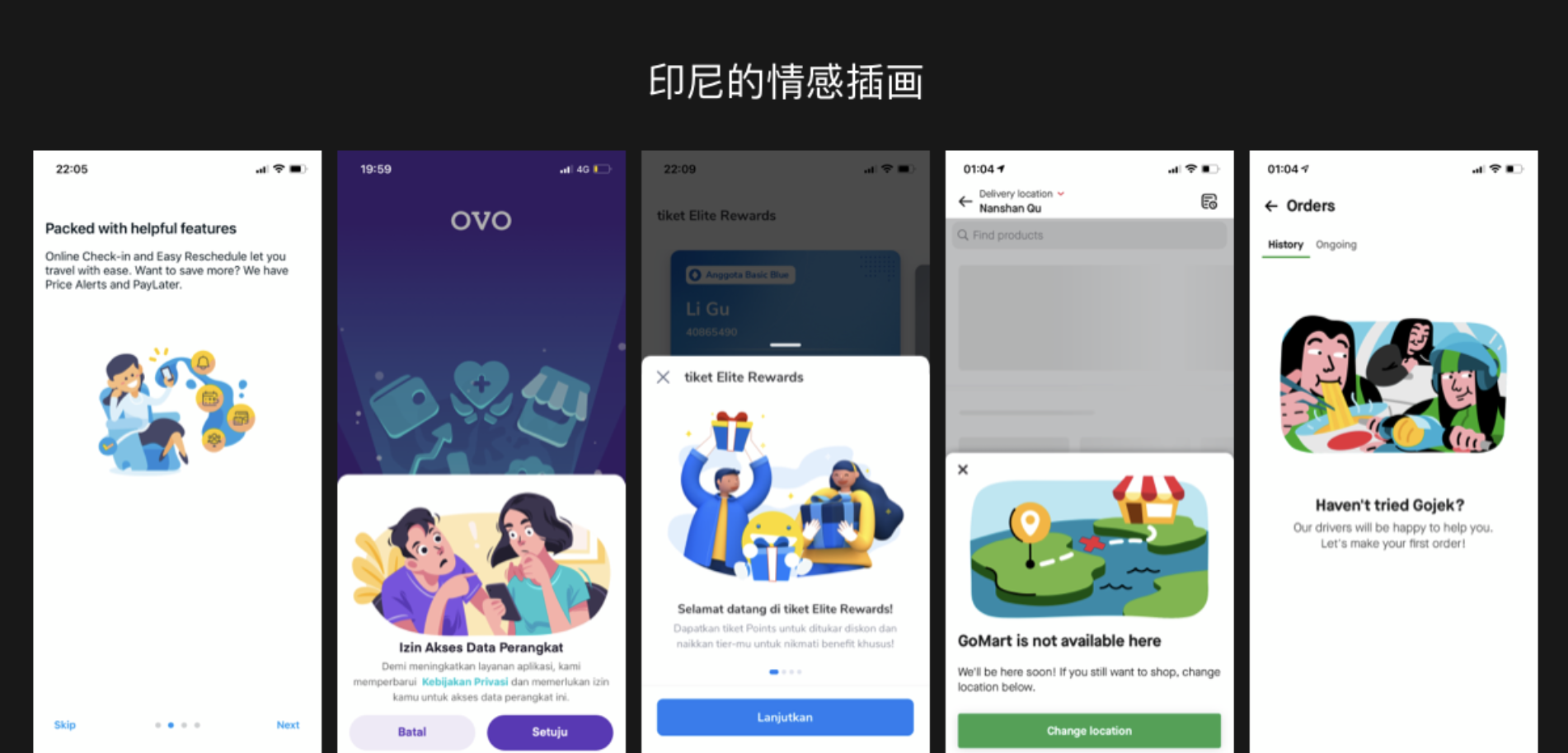 截了幾大主流 APP 的部分插畫場景,都是采用的扁平或 3D 風格。在 hofstede 的文化維度研究中,印尼是集體主義國家,集體主義國家在創(chuàng)作上喜歡用生活常見的生活符號來傳遞深層的含義。比如下圖中的引導和缺省頁場景,引導的同時也運用了生動有趣的生活上的情感插畫來緩解和安撫用戶的體驗情緒。在設計表現(xiàn)上,插畫的色彩鮮明,高飽合的色彩喚醒度較高,容易把用戶的注意力轉移到畫面上來,且插畫都是圍繞一個故事性的場景來開展,具有很強的觀賞性,從而打造了良好的用戶體驗流程。