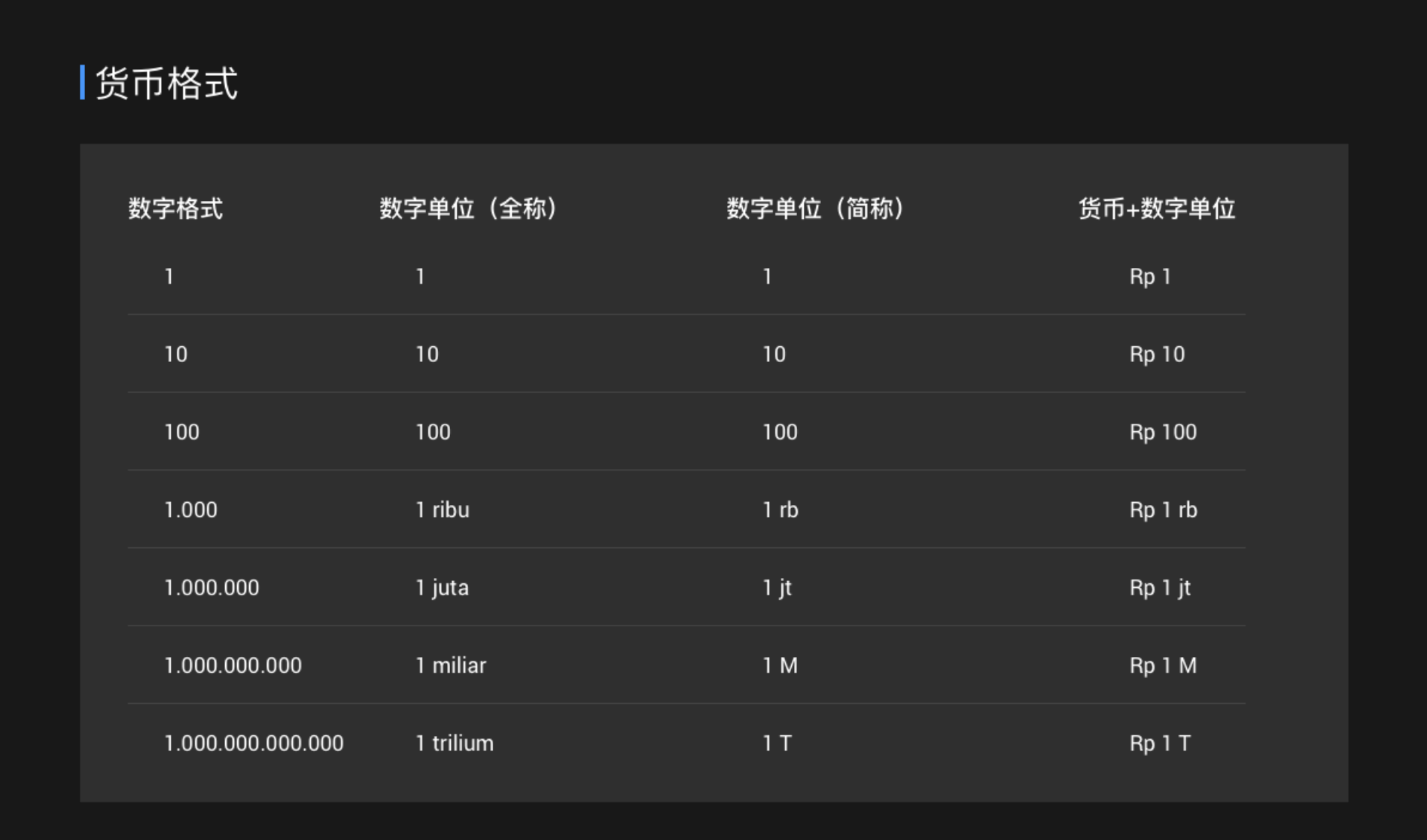 印尼的貨幣符號是 Rp,貨幣名稱是 IDR ( 印度尼西亞盧比)。 在印尼,表示千位的寫法有兩種,Rp2.000 或者是 Rp2 rb ( rb 是 ribu 的縮寫 ), 但是 Rp2.000 的用法更多些。印尼沒有萬的概念,對于大額的數(shù)字,在正式場景中,比如商品標價或銀行的收據(jù),都會將金額全部展示出來,不會使用縮寫。只有在非正式場合,例如需要快速吸引人眼球的新聞標題或海報中才會出現(xiàn)。