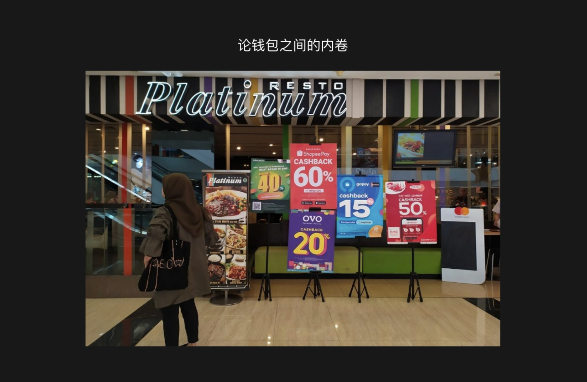 另外,當?shù)氐闹Ц斗绞揭卜浅6鄻踊谟∧岙數(shù)?,可以看到滿大街關于錢包的 cashback 廣告。目前印尼主流的錢包支付有 GO-pay、OVO、Dana、LinkAja、ShopeePay。