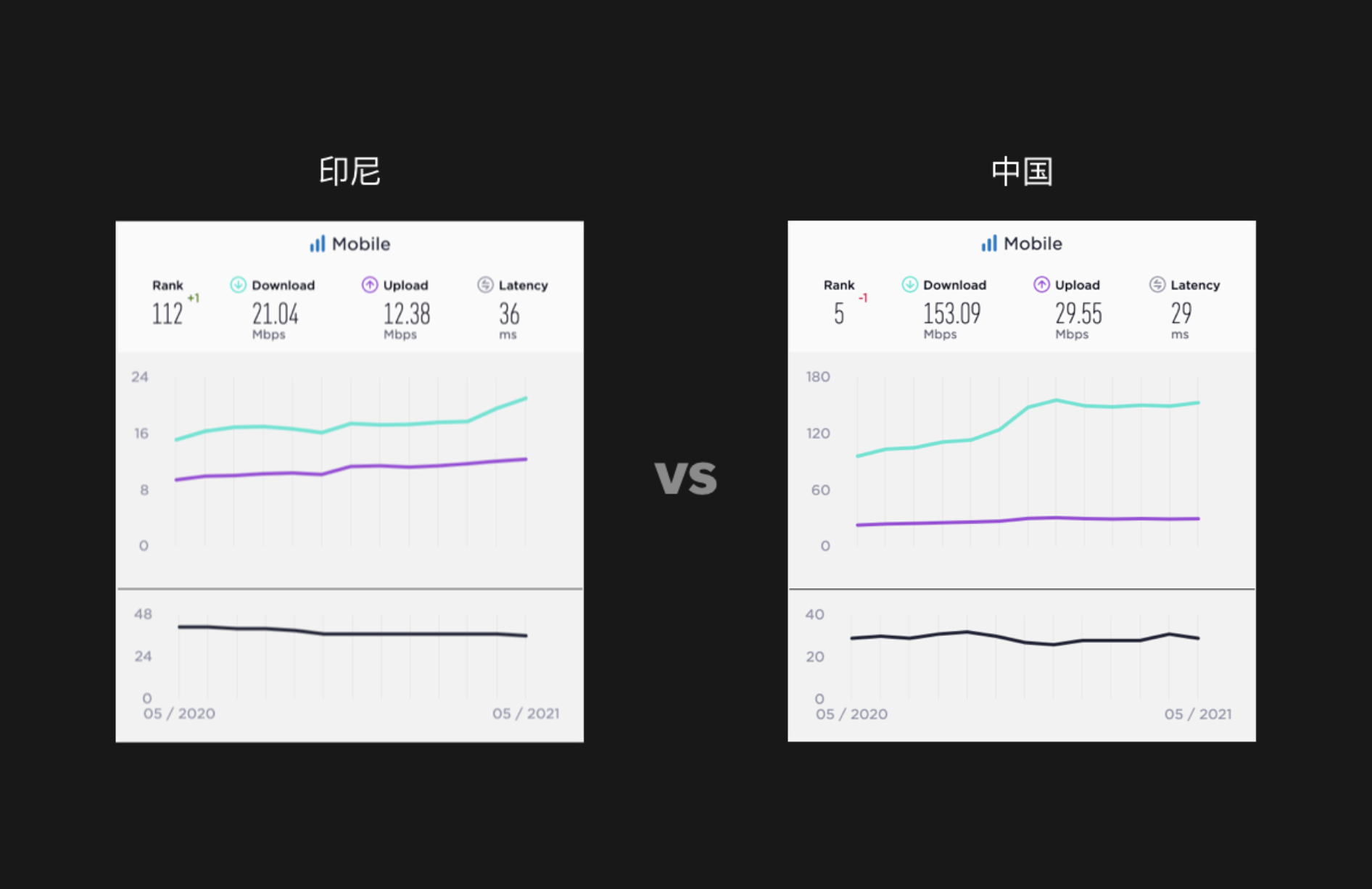 下圖是 2021 年數(shù)據(jù),印尼的下載網(wǎng)速 21.04Mbps, 在全球排名 112。中國的下載網(wǎng)速是 153.09Mbps, 全球排名第 5,進行對比后大家對印尼的網(wǎng)絡環(huán)境應該更有體感了。