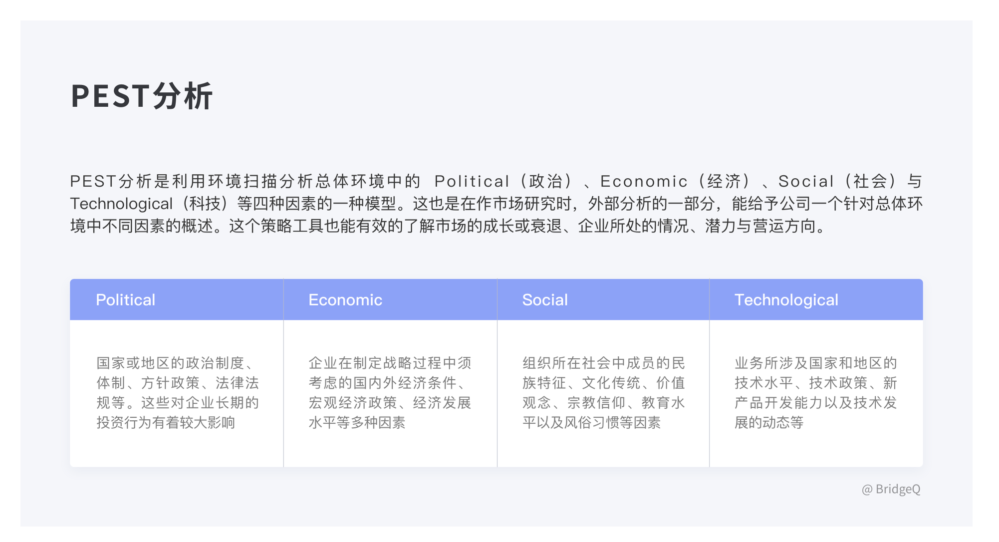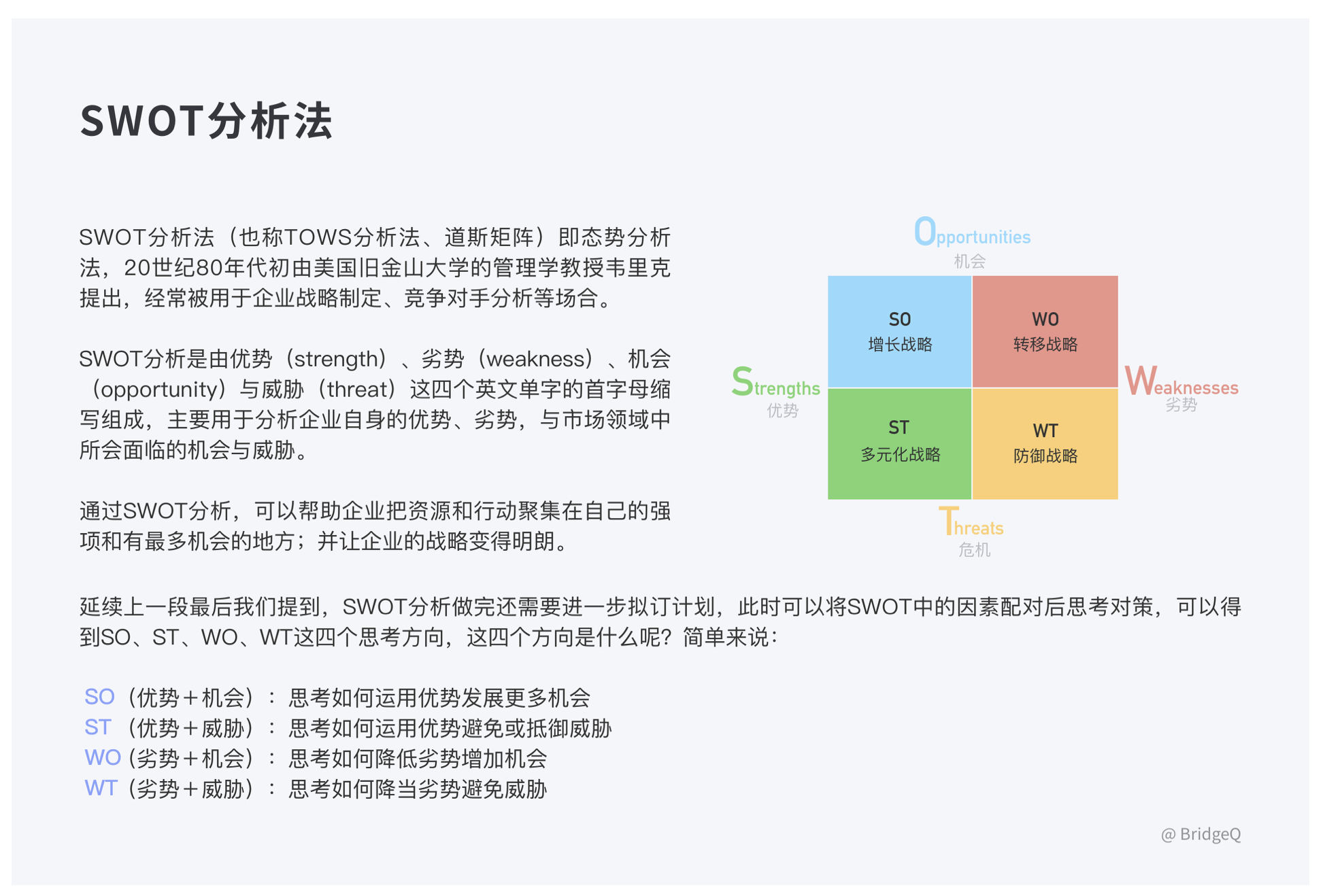 :PEST(宏觀環(huán)境)、波特五力模型(競爭態(tài)勢)、SWOT 分析(優(yōu)劣勢)。