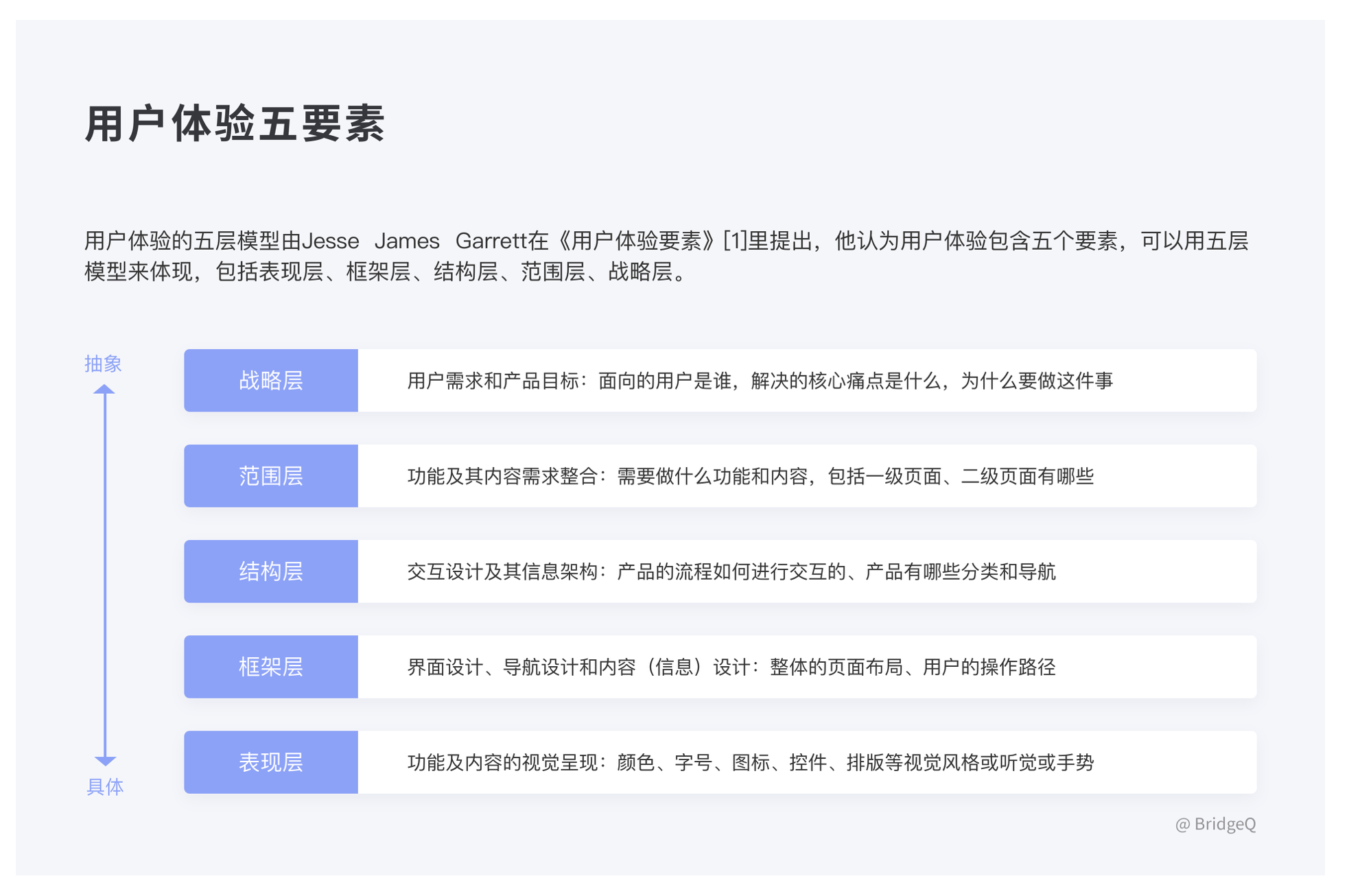:用戶體驗五要素(戰(zhàn)略層、范圍層、結(jié)構(gòu)層、框架層、表現(xiàn)層)。
