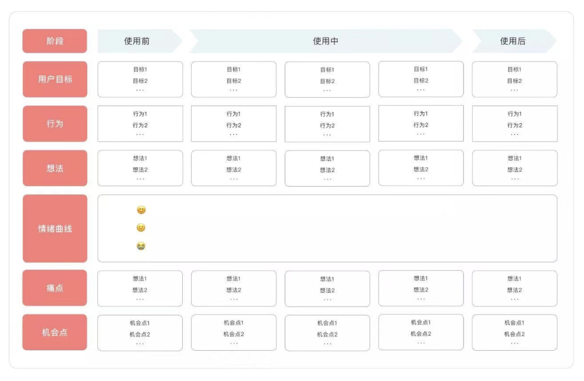 :可視化用戶全流程行為與情緒,還原 “使用前 - 中 - 后” 階段的目標(biāo)、觸點與痛點。