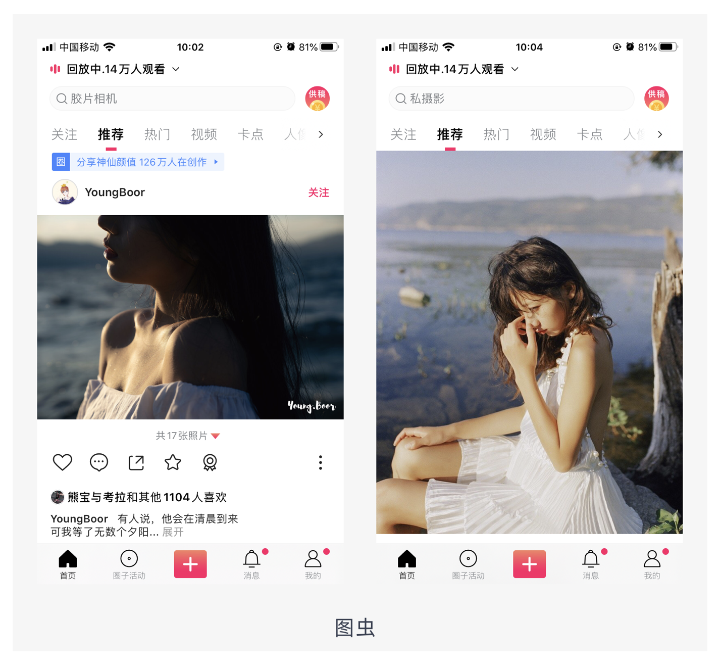 - 隨圖片而變化:當(dāng)用戶上傳不同比例的圖片時(shí),圖片展示寬度為屏幕寬度,展示高度根據(jù)確定的寬度等比例縮放。這種適配方式能將圖片信息表達(dá)完善,但圖片占用空間大,適合圖片質(zhì)量高、用戶以瀏覽圖片為主的產(chǎn)品,如圖蟲。不過(guò)需要注意的是,采用該方式需要設(shè)置最大最小閾值,當(dāng)圖片的高度超過(guò)一定數(shù)值,高度就不再增加,當(dāng)圖片的高度小于一定數(shù)值,高度不再減小。