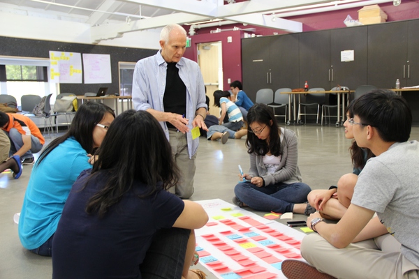 (圖為學(xué)員們在D.School用便利貼和海報(bào)紙來記錄想到的點(diǎn)子,白發(fā)老爺爺是D.School的講師,以前是Yahoo的PM,專門帶Ideate這一部分,講師們都有自己最擅長和最喜歡帶的一個(gè)模塊)