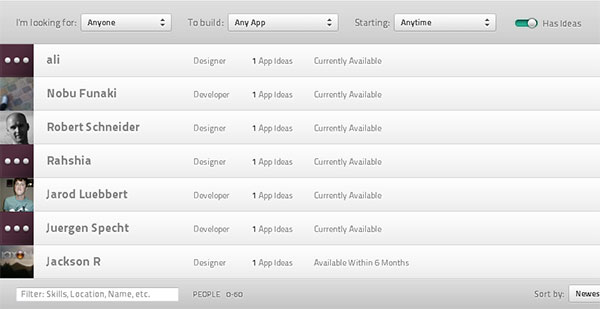 當有大量數(shù)據(jù)要處理的時候過濾就很有用。使用下拉列表,單選按鈕或者復(fù)選框進行過濾選擇。 在下面的例子里, builditwith.me使用下拉列表來對用戶的職業(yè)興趣和當前狀態(tài)進行過濾。