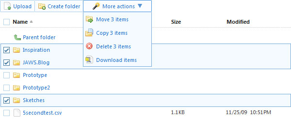 這種方式可以很好地讓用戶批量完成多行的操作。選中每一行前面的復(fù)選框,點擊批量操作鏈接或按鈕,用戶可以選中多行進行操作。還是以DropBox為例,用戶可以選中多條文件,點擊菜單進行批量操作。