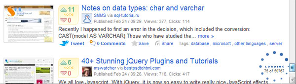 與分頁相反,連續(xù)滾動是一種新型的數(shù)據(jù)顯示方式。這種方式不需要選擇特定的數(shù)據(jù)類型,新的數(shù)據(jù)被加到列表里。在加載的時候顯示進度,如下例所示,在dzone.com里,進度條顯示有多少項已經(jīng)被加載。