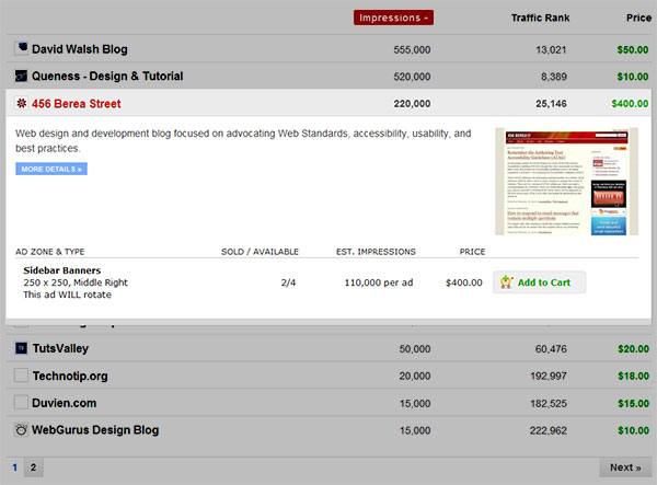 關(guān)于這種模式我寫過一篇文章,也建了一個可以輕松實現(xiàn)的jQuery小插件。 這種模式的關(guān)鍵點就是可以給表格增加更多相關(guān)信息功能。以BuySellAds為例,展開行顯示了出版商的廣告詳細信息,同時始終顯示主行里的重要信息。