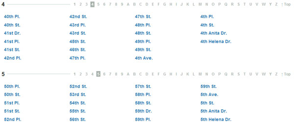 Product Planner 采用了標準的分頁顯示,有頁碼數(shù)字,有上一頁下一頁。但是,你能告訴我第2頁是什么? 第3頁?當然你不能。不用擔心,標準分頁可以得到改善。如下所示,通訊錄很龐大,他們使用了數(shù)字和字母來分頁。在這個例子里顯示所有的頁和隱藏頁一樣好。你可以以此類推應(yīng)用到其他條件相似的表格。如果表格以日期來分類,你可以以日期范圍來替代傳統(tǒng)的分頁數(shù)字(如第1頁可以寫成2.10-2.12,等等)