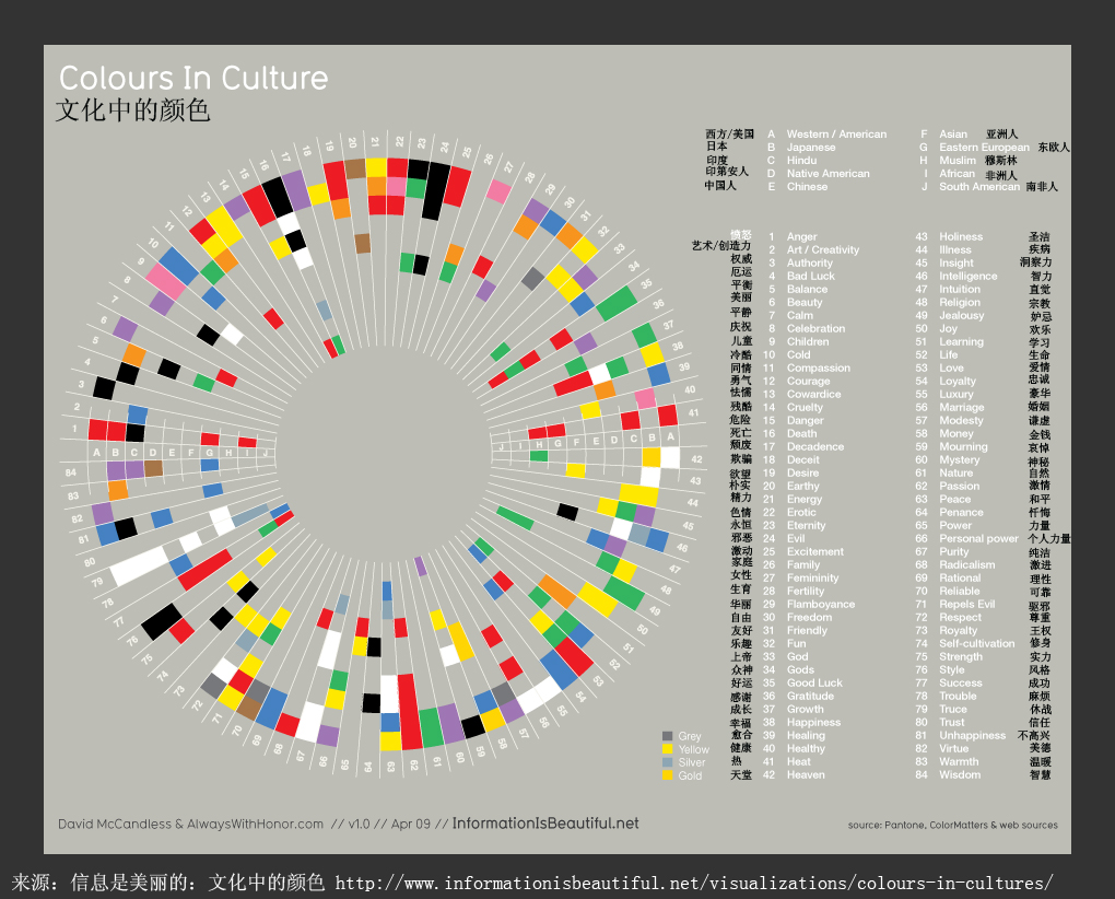 下面的圖表里包含了十種不同的文化,和62種情緒。同心圓代表不同的文化,而小方片代表了不同的情緒。因此,如果你想了解熱日本人對(duì)顏色的感覺(jué),你就要看看這幅圖。如果你想知道在不同文化中什么顏色表示“危險(xiǎn)”的話,你就要縱向的看這幅圖。