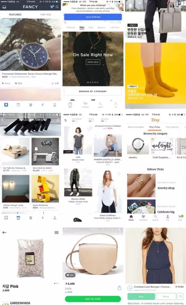 接下來(lái)我們就需要對(duì)這些 apps 進(jìn)行視覺(jué)風(fēng)格上的拆分,來(lái)看看到底是哪些視覺(jué)表現(xiàn)讓大家覺(jué)得它們是時(shí)尚、簡(jiǎn)潔的。我們可以依據(jù)經(jīng)驗(yàn)對(duì)視覺(jué)表現(xiàn)劃分幾個(gè)維度(比如以下幾個(gè)),接下來(lái)我將以購(gòu)物應(yīng)用為例,從以上幾個(gè)維度來(lái)示意分析的方法。