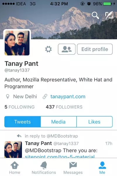 案例學(xué)習(xí):Twitter上的切換鍵被放在屏幕的端。這幫助用戶更加快速的觸碰相關(guān)鍵如主頁(Home)、通知(Notifications)、消息(Messages)、我(Me)以進(jìn)入軟件的各個(gè)部分。他們?cè)?jīng)將按鍵放在了最頂端,然而這增加了大屏用戶使用難度。